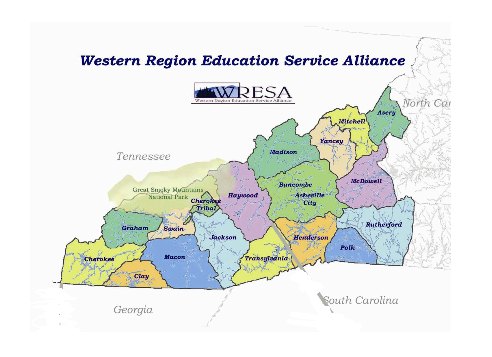 WRESA Members School Districts Asheville City Schools Avery County Schools Buncombe County Schools Cherokee County Schools Cherokee Central Schools Clay County Schools Graham County Schools Haywood County Schools Henderson County Schools Jackson County Schools Macon County Schools Madison County Schools McDowell County Schools Mitchell County Schools Polk County Schools Rutherford County Schools Swain County Schools Transylvania County Schools Yancey County Schools Schools ArtSpace Charter School Asheville Catholic School Brevard Academy Emmanuel Lutheran School Invest Collegiate Imagine Lake Lure Classical Academy Mountain Discovery School New Kituwah Academy Shining Rock Classical Academy The Mountain Community School
